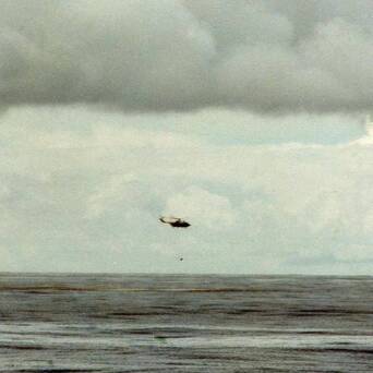 导弹弹头随后释放出染色剂把海水染成绿茵一片,我方2000米高空遥测飞机捕获了导弹弹头位置并传给了打捞的直升机。打捞直升机急速向目标飞去,却在途中遭遇浓积云,在这种云里飞行稍有不慎就会粉身碎骨!此时如果绕云飞行,很可能外国飞机和舰船早已将数据舱捞走!飞行员心中一横,竟冒死驾机直接穿云而过,从1000米迅速下降到500米,4分钟便赶到了数据舱上空30米处悬停。